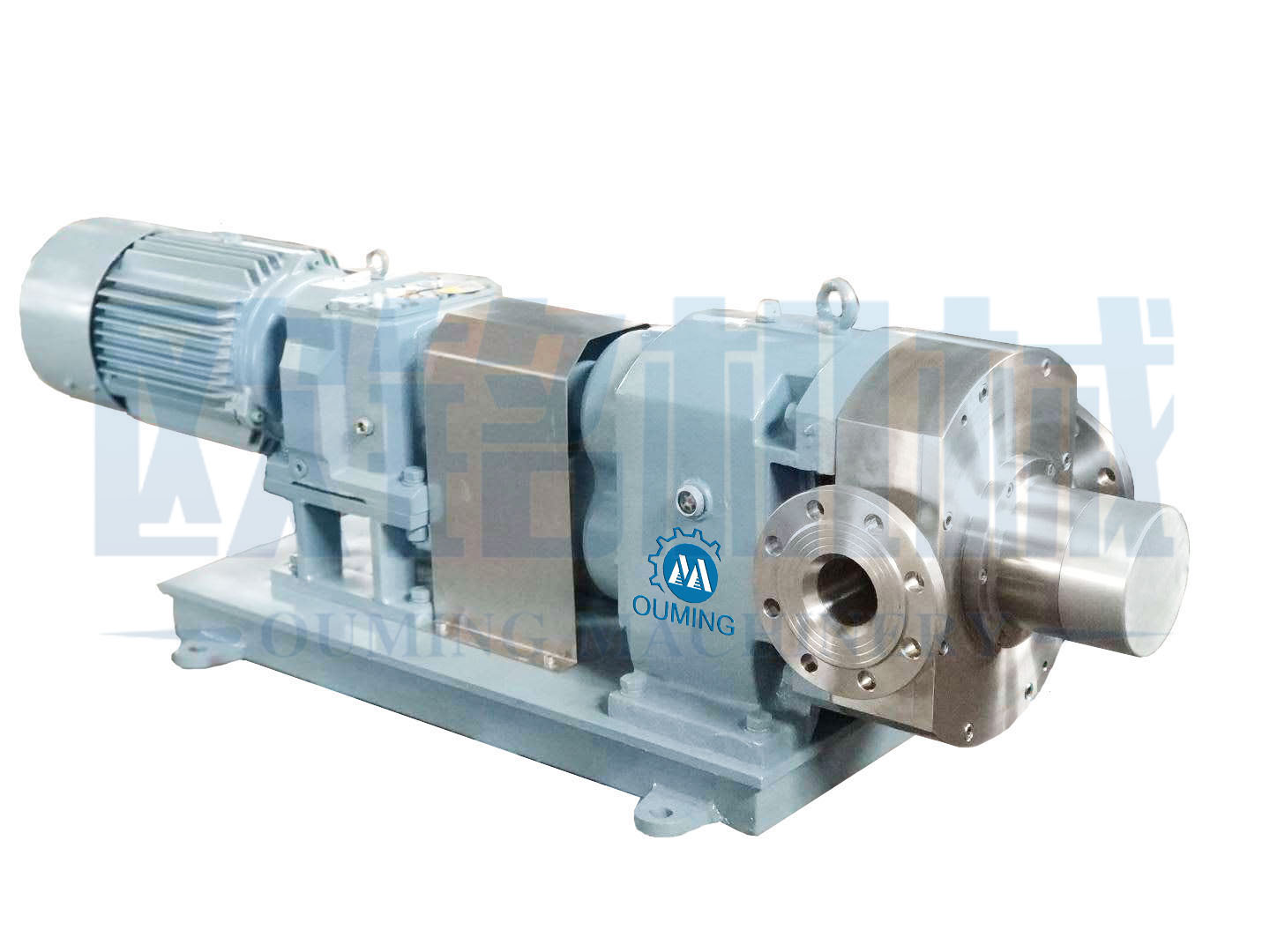 該產(chǎn)品借助于工作腔里的多個固定容積輸送單位的周期性轉(zhuǎn)化來達(dá)到輸送流體的目的。原動機(jī)的機(jī)械能通過泵直接轉(zhuǎn)化為輸送流體的壓力能,泵的流量只取決于工作腔容積變化值以及其在單位時間內(nèi)的變化頻率,而(理論上)與排出壓力無關(guān);轉(zhuǎn)子泵依靠兩個同步反向轉(zhuǎn)動的轉(zhuǎn)子(轉(zhuǎn)子葉數(shù)為2-8)在旋轉(zhuǎn)過程中于進(jìn)料口處產(chǎn)生吸力(真空度),兩轉(zhuǎn)子將轉(zhuǎn)子室分隔成幾個小空間,在傳動軸的帶動下進(jìn)行反方向旋轉(zhuǎn),介質(zhì)即被輸送至出料口,從而產(chǎn)生了較高的排放壓力,如此往復(fù)循環(huán),特別適合中高粘度介質(zhì)的輸送。